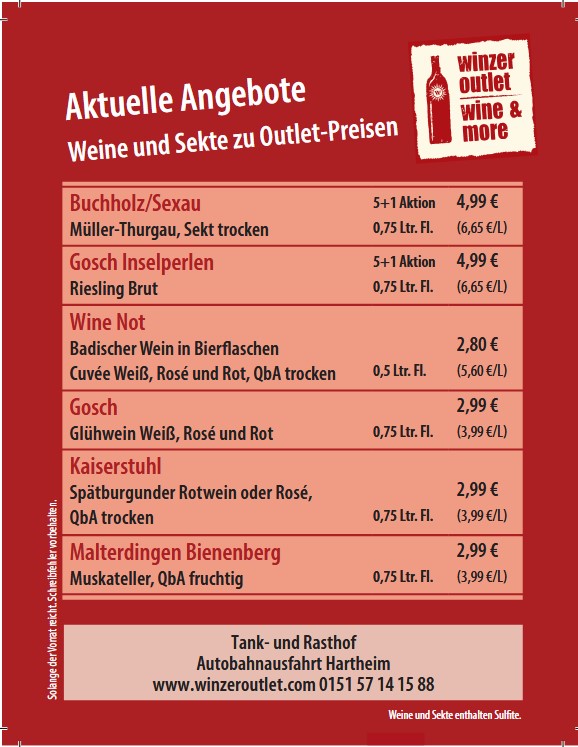 Herzlich Willkommen im Winzer Outlet! Sie können ferner vorbestellen und abholen.